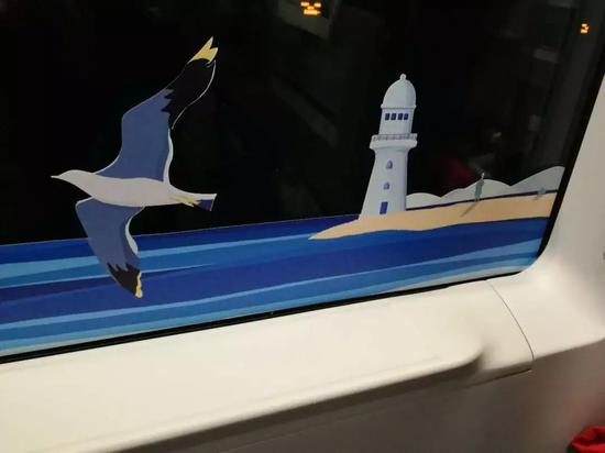 “海洋之情”专题特选了列车终点站青岛最具代表的海洋、建筑、海鸥等元素装点,让乘车的旅客望向窗外时放仿佛已经置身于家乡。