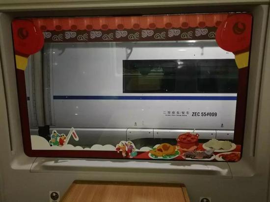 “年味”和“回家过年”两个车厢的装饰设计颇具中国风,红色的剪纸、鞭炮、年夜饭元素不仅能体现过年的喜庆氛围,传达“除旧迎新”的美好寓意,也让乘客坐在窗边的餐桌用餐时,仿佛置身于家中享受年夜饭一般温暖。